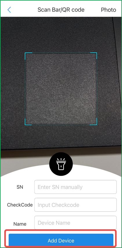 Step 3: Use phone scan Bar/QR code, and then click “Add Device”.