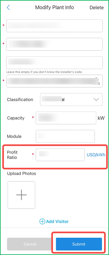 Set profit ratio/Adjust the price per kWh in the SEMS app Crystal Xu 05 February 2026 02:47 Click this icon on Plants page and reset “Profit Ratio” on Modify Plant Info page. Comments 0 comments Please sign in to leave a comment.
